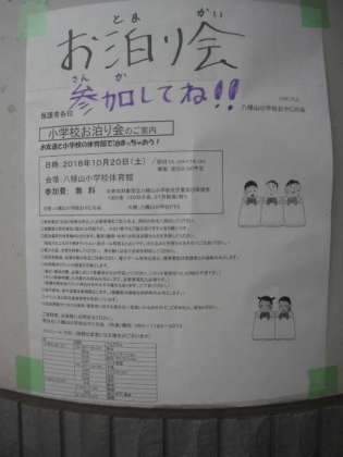 おやじの会が主催している「お泊まり会」が、来週20日(土)に開催されます。既にご案内のお手紙が配布されていると思いますが、まだ申し込みを受け付けています。校内にも掲示がされていますので、再度検討していただき、たくさんの子どもたちに参加していただきたいと思います。