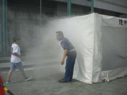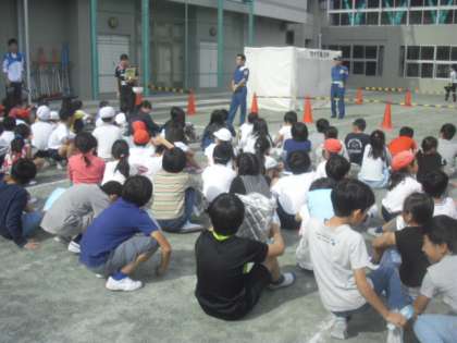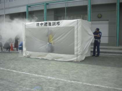 全体の避難訓練終了後に、烏山総合支所地域振興課防災係の職員の方々のご協力をいただき、4年生が煙に対する避難方法の体験学習をしました。火災発生した時の避難で気をつけたいこととして、煙を吸い込まないようにすることや、見通しの悪い煙の中をどうやって逃げるかについて、実際に訓練用の煙の中に入って体験しました。子どもたちは真剣に訓練に参加して、とても意義のある体験をさせていただきました。