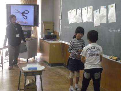 今日は、2年生で外国語活動の授業が行われました。ALTのアグネス先生と担任の先生が協力しながら、授業を進めます。今日は、英語によるジャンケンで盛り上がっていました。子どもたちはジェスチャーも交えながら、友達同士で楽しく交流することができました。