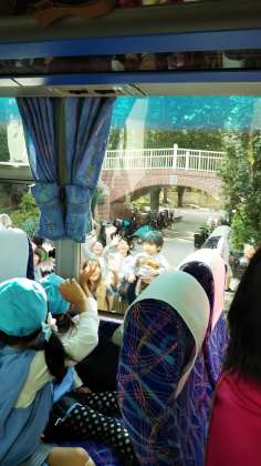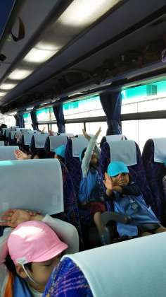 今日は、八幡山幼稚園のバス遠足です。希望ヶ丘公園に集合してバスに乗りました。おうちの方の熱いお見送りに、「行って来ます!」と手を振って出発しました。