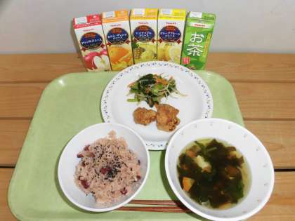 「お赤飯、鶏肉の唐揚げ、野菜の辛子醤油、すまし汁、セレクトジュース」です。