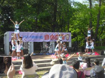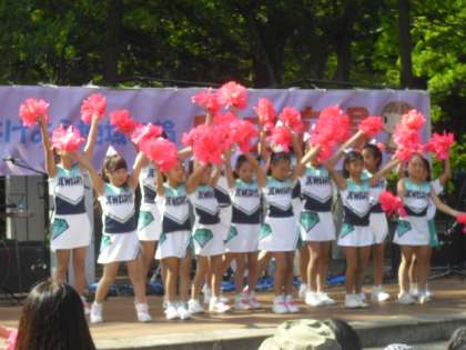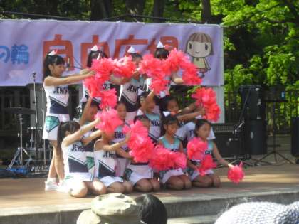 10時の開会式の後、中央のステージでは、歌やダンスなどの出し物で盛り上がります。11時からは、八幡山小学校で活動しているキッズチアリーディングチーム「Jewelrys(ジュエリーズ)」のパフォーマンスが披露され、たくさんの拍手と声援を受けました。