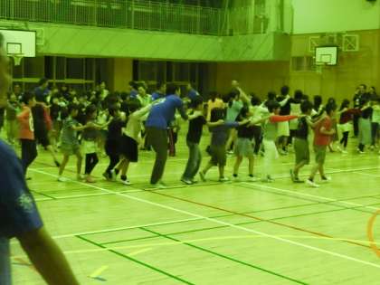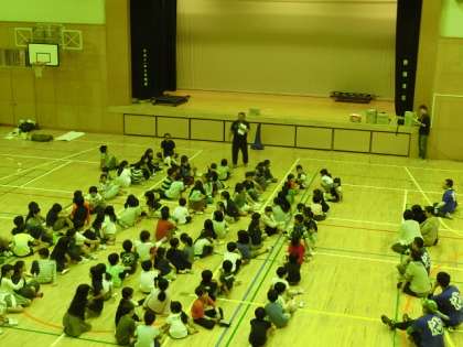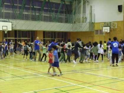 楽しいアトラクションは続き、体育館は子どもたちの熱気で暖かく感じられました。また今日は、八幡山町会の尾崎さんのご協力を得て、防災倉庫の見学も行われました。災害時に学校に泊まる時の備えになりました。