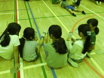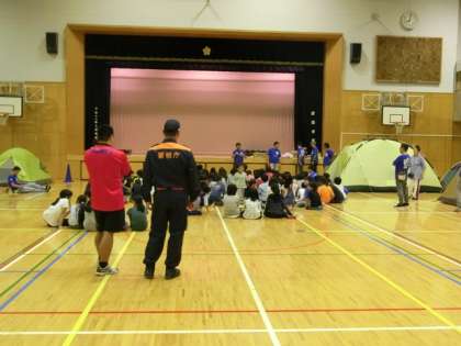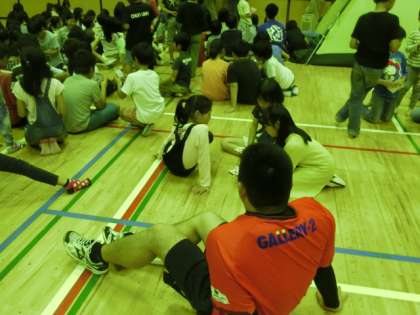 おなかがいっぱいになった後は、体育館に戻って豪華賞品がもらえる「ビンゴ大会」。今年はどんな賞品がもらえるか、とても楽しみです。数字がそろわなくても、落ち着いて次の番号を聞きましょう。八幡山駐在所の武藤さんと利根川先生も駆けつけて、子どもたちを見守ってくれました。