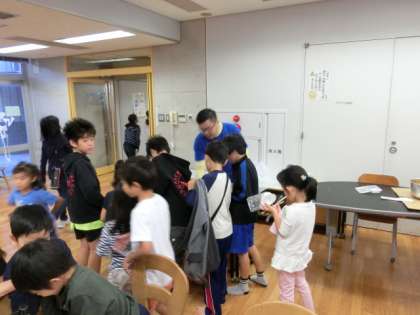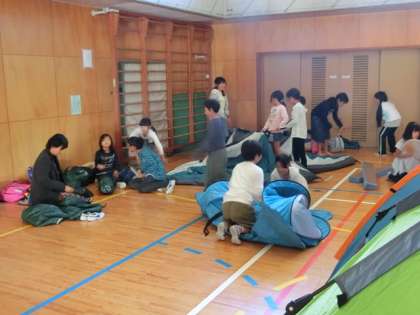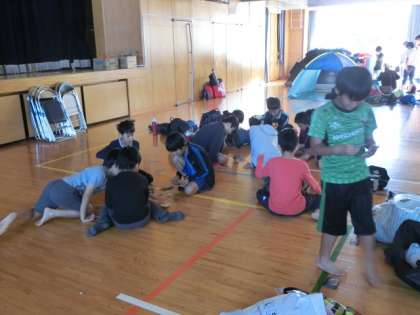 しっかり朝食も食べられました。この後は片付けをします。お家の人がテントを片付けに来てくれたり、まだまだ遊び足りない子などもいたりで、体育館は賑やかです。