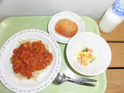 「スパゲティミートソース、マセドアンサラダ、りんごかもしれないマフィン、牛乳」です。