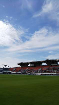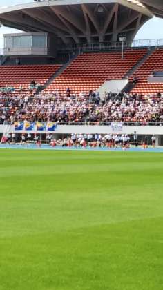 朝の曇り空から、一転綺麗に晴れ来ました。コースでは、女子の100メートル走が行われています。