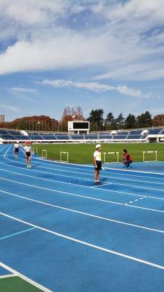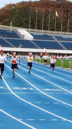 男子の400メートルです。スタンドの声援も最高潮です。八幡山小学校は、第2レースと第5レースに出場しました。力強く走りきりました。