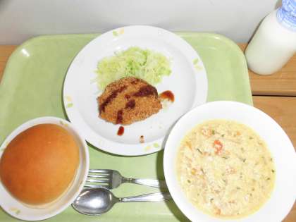 「ミルクパン、ポテトコロッケ、茹でキャベツ、卵スープ、牛乳」です。