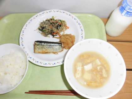 「ごはん、めぐろのさんまの塩焼き、青菜の乾物和え、味噌汁、牛乳」です。