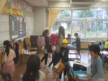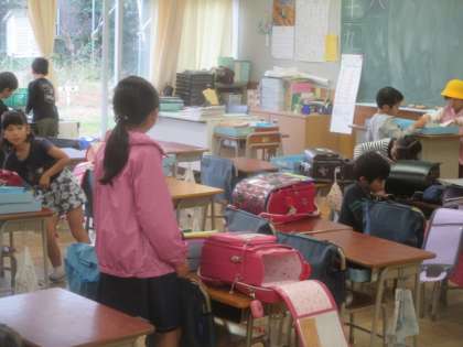 1週間の終わり、金曜日の朝です。1年生は6年生のお姉さんたちといっしょに登校です。とてもうれしそう。身じたくも自分でやって、1時間目の準備に入ります。今日がんばれば、土日はお休みです。みんな1日がんばっていきましょう。