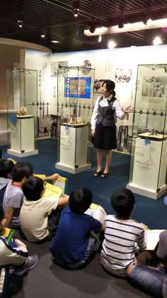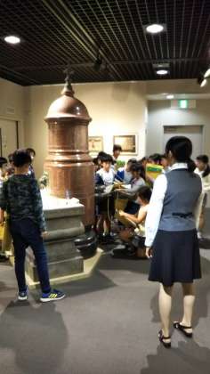 東京都水道歴史館に到着しました。クラスごとに分かれて、東京の水道の特徴と歴史を学びました。説明のお姉さんの話をしっかりと聞いてメモを取っていました。