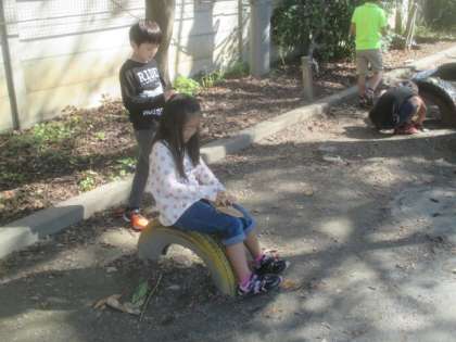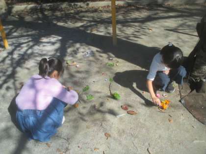 2組の3・4時間目は図工の授業。今日は「ちきゅうからのおくりもので」の単元の学習で、校庭に出て活動しました。校庭の木々の下の落ち葉や小枝などを集め、貼り合わせたり組み合わせたりして作品を作ります。女の子はブローチを作ったり、男の子は葉っぱで顔を形取ったりして、楽しい活動になりました。今日も爽やかな青空の下で、子どもたちの笑顔がいっぱい広がっていました。