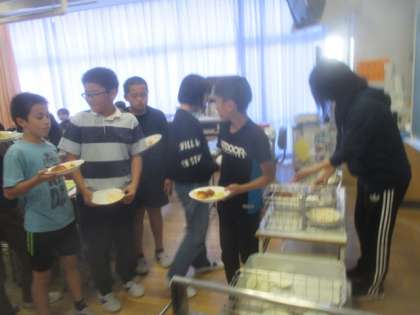 今日の給食のメインディッシュは、豆腐入りハンバーグです。高学年の教室では、おかわり争奪戦が繰り広げられていました。モリモリ食べて、午後の勉強もがんばりましょう。