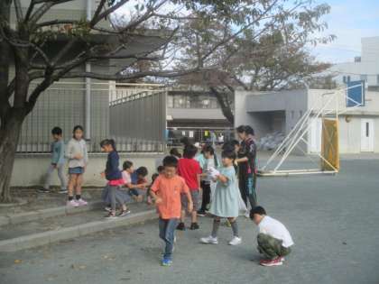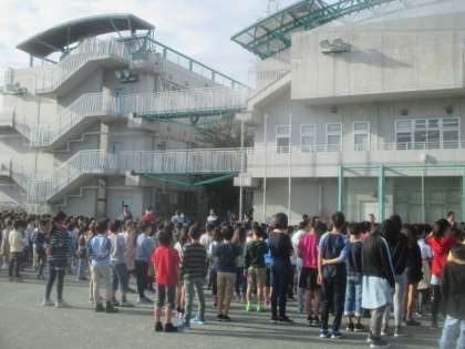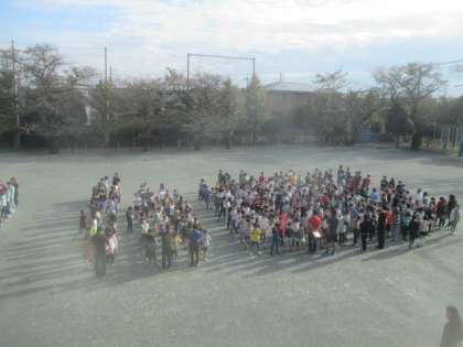 今朝の集会は、地域清掃活動の一環として毎年行っている、落ち葉拾い集会です。全校児童で、校庭や校舎正門付近などの落ち葉を拾います。それぞれの学年・クラスで分担を決めて取り組みました。