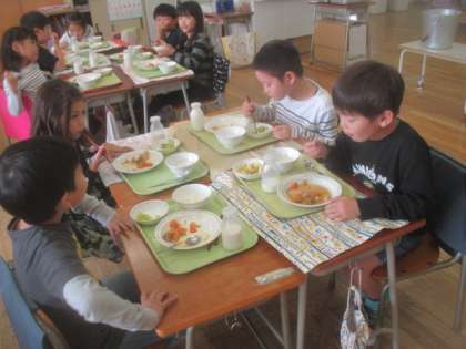 今日の給食は、旬の野菜を使った福岡の郷土料理の「がめ煮」と、「野菜の甘酢かけ」です。3年生の教室をのぞくと、がめ煮はよく食べていましたが、野菜の甘酢かけはたくさんおかわりが残っていました。身体のために、野菜もたくさんいただきましょうね。