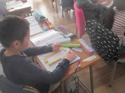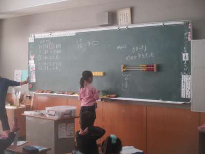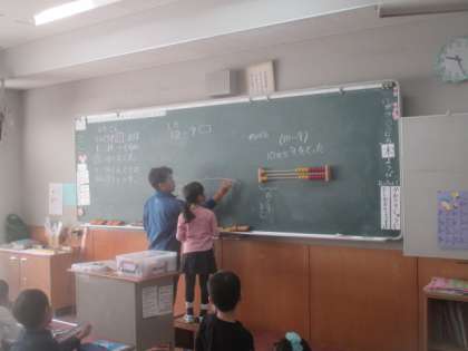 2組の算数は、ひき算の学習です。教具を使いながら、ひき算のやり方について、自分の考えを発表します。担任の先生に助けてもらいながら、みんなの前でしっかり説明できました。