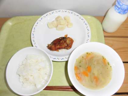 「ごはん、鯖の変わりソースかけ、粉ふき芋、スプーンおばさんのマカロニスープ、牛乳」です。