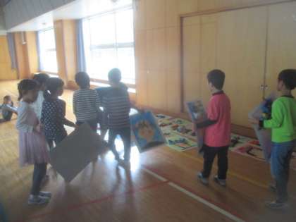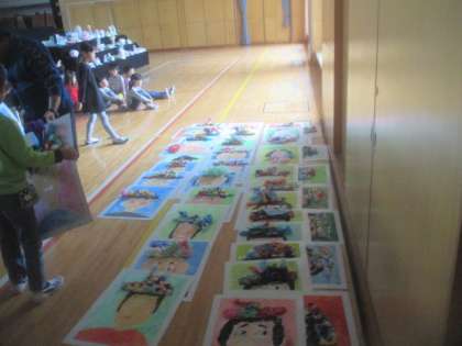 1年生が展覧会の平面作品「おしゃれなぼうし」を体育館に搬入しました。展示は放課後に先生方で行います。どんどん作品が飾られています。