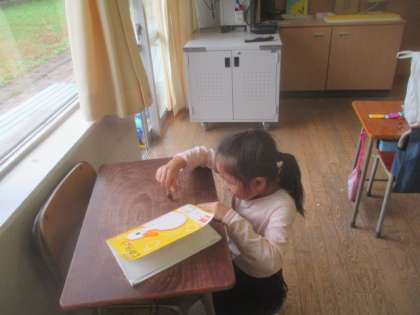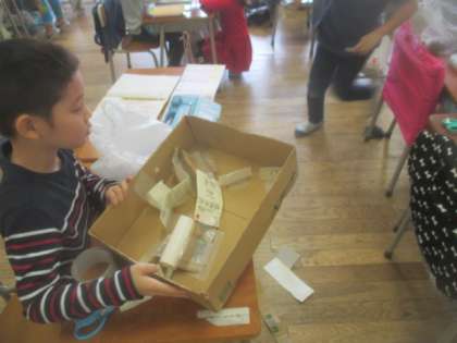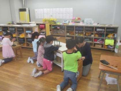 今日は2組で、生活科の「たからものであそぼう」の学習です。おもちゃ作りに取り組みました。木の実に穴を開ける道具も上手に使いこなしながら、コマ作りにチャレンジしたり、迷路やアクセサリーなどを作ったりしていました。どの子もいろいろ考えながら、おもちゃ作りに夢中になっていました。