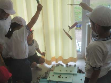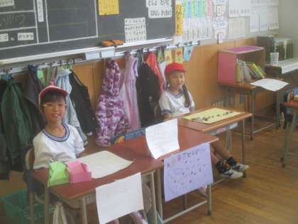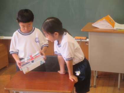 1年生の生活科ほうは、「たからものであそぼう」の学習で作ったおもちゃを使って、友達同士で交流しました。自分で作ったおもちゃを友達に紹介し合って、使い方や工夫したところなどを説明します。おもちゃで遊ぶのは楽しいですが、みんなに楽しんでもらうことのよさも実感できたようです。