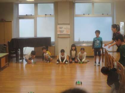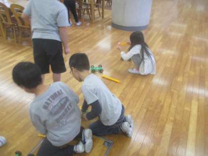 1組の午後の理科の授業は、「ゴムのはたらき」の学習です。ランチルームで、ゴムで動く教材の車を使った実験をしました。それぞれで車が動いた距離を測り、比較して違いを検証します。子どもたちは楽しみながら、実験で分かったことを話し合っていました。