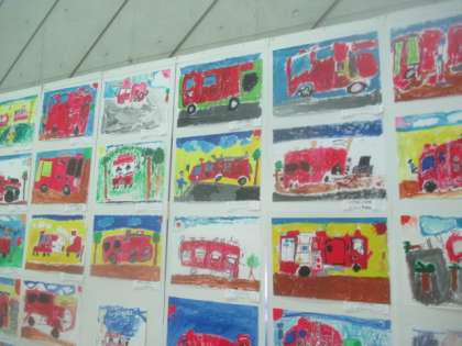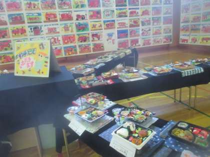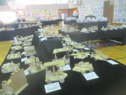 広い体育館ですが、子どもたちの作品が所狭しと並んでいます。