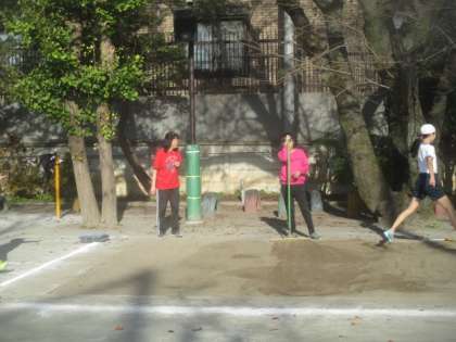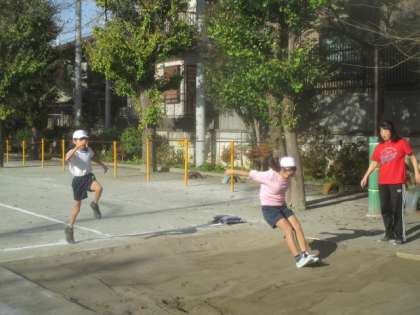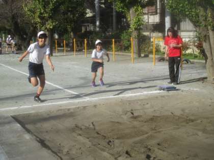 午後5校時の2組の体育は、校庭で走り幅跳びの学習です。踏み切る足と前傾姿勢を意識して、繰り返し練習します。助走のスピードと踏み切りのタイミングを調整しながらの跳躍は、さすが最上級生。迫力満点でした。