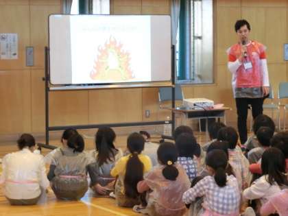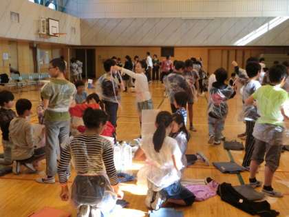 5年生は、第2体育館での造形活動です。建築士会の方々をゲストティーチャーにお迎えして、ポリ袋を使った「ふわふわ空気のお家をつくろう」の活動を行いました。まずは、それぞれ子どもたちは、自分の身体にポリ袋を巻いてみます。ポリ袋は保温性にも優れ、災害時にも簡単に使える優れものであることを学びました。