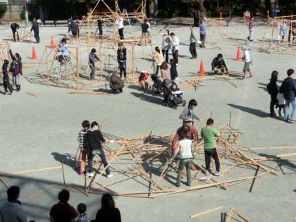各グループの発表を通して、お互いの作品を見合うことで、認め合い、共感する心が育ちます。周りからも大きな拍手が起こり、校庭全体に笑顔があふれました。最後の片付けも