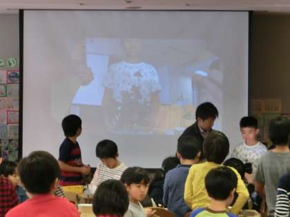 できあがった作品をみんなの前で紹介します。自分の創作イメージを説明するのは、なかなか難しかったようですが、子どもたちも必死に思いを伝えようとがんばっていました。できあがった作品は、2階のフロアに展示されました。