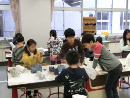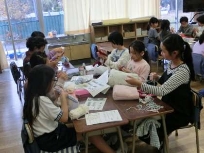 手芸クラブは黙々と作品作りに没頭し、必要に応じて担当の先生が助言していました。科学クラブでは、卵落としの実験をするために、必要な装置を自作していました。