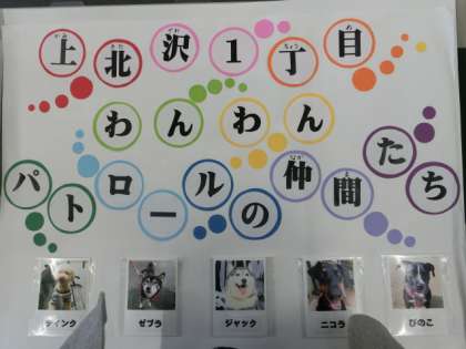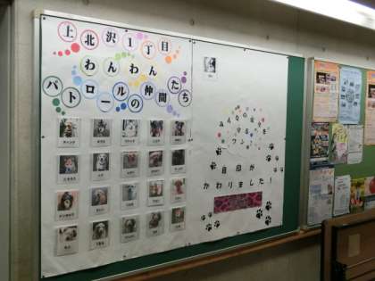 日頃子どもたちの登下校の安全を見守っていただいている、上北沢1丁目自治会の「わんわんパトロール」のワンちゃんを紹介する写真が、1階昇降口前に掲示されました。たくさんのワンちゃんと飼い主の皆さんが、八幡山小学校の学区域のいろいろな所で、子どもたちの安全を見守ってくれています。ありがとうございます。