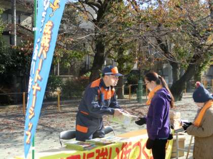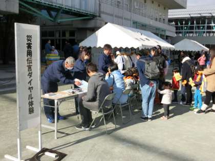 災害用伝言ダイヤル体験と、火育コーナー・警察PRコーナーです。ここでも、八幡山駐在所の武藤巡査部長さんにお手伝いいただきました。