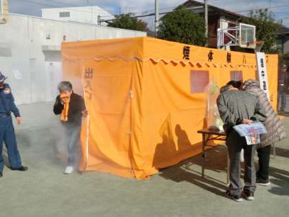 初期消火訓練では、実際に火を使って消火体験をしてもらいました。地震体験や煙中避難訓練には、長蛇の列ができていました。
