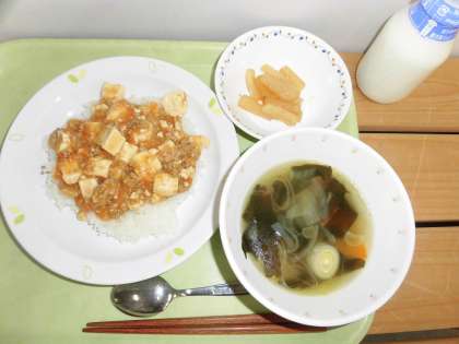 「麻婆豆腐丼、大根の中華味、わかめスープ、牛乳」です。