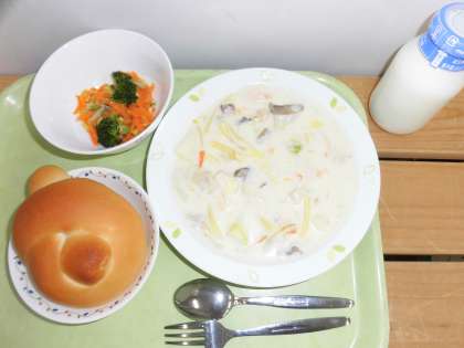 マカロニのクリーム煮は、大きめのマカロニが納品されたので、ボリュームのある主菜になりました。柔らかなミルクパンとも相性が良く、美味しく、楽しい給食時間になりました。