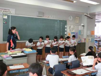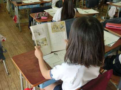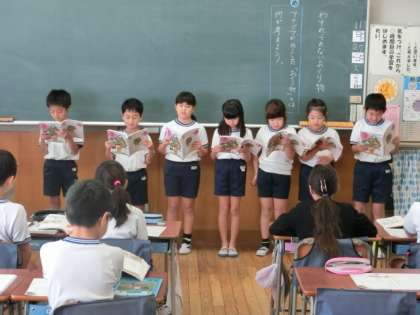 1組の国語の授業は、「わすれられないおくり物」の学習。今日は日頃の音読の成果を、みんなの前で発表しました。グループ数名で、登場人物の気持ちを考えながら、読み方や声の調子を工夫して発表します。いつも親しくしているクラスの友達の前ですが、子どもたちは少し緊張気味に音読をしていました。