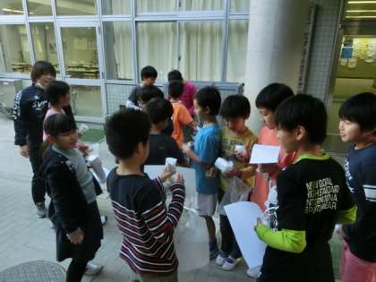 今日の科学クラブは、これまで準備を進めてきた「卵落とし」の、いよいよ実験本番です。実験装置を円錐形にしたり、緩衝材や落下時の空気の抵抗を考えたりして、卵が割れないような工夫をいろいろと吟味しながら準備をしてきました。実際には、3分の2の児童が成功しました。実験後には、結果の考察もしっかり行いました。楽しい実験になったようで、子どもたちも笑顔いっぱいでした