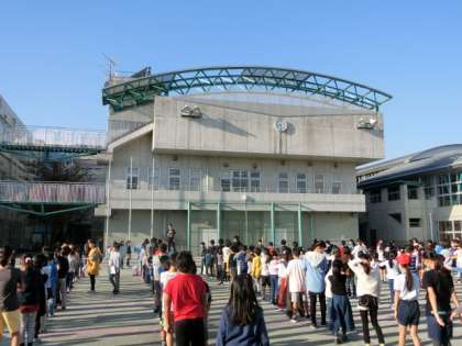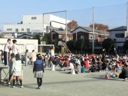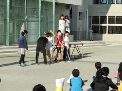 久しぶりの児童集会。今日はなかよし班での活動です。ボールを使ったゲーム集会。なかよし班のペアで1列に並んで、ボールを頭の上や足の間を通して運びます。まずは、集会委員の児童がルールを説明しました。