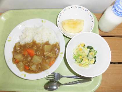 「せたがやそだちカレーライス、白菜とコーンのサラダ、りんご、牛乳」です。