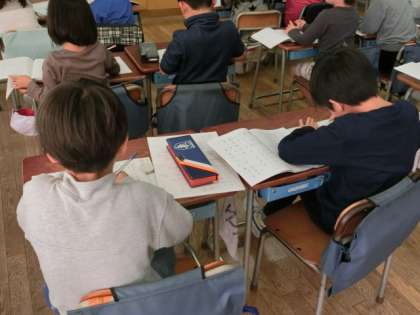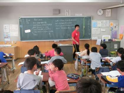 2組の4時間目は、生活科のまとめの学習です。「町たんけん」で気づいたことなどを、作文にしてまとめます。先生の楽しい説明で盛り上がった後、子どもたちはノートを見ながら書くことを整理していました。