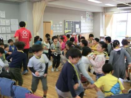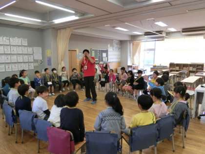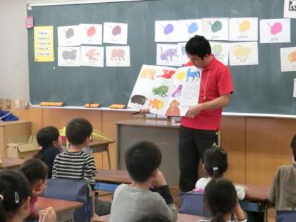 来週の校内研究授業に向けて、2組の畑中教諭が、1組で外国語活動の事前授業を行いました。紹介する絵本に出てくる動物を使ったアクティビティ。フルーツバスケットならぬ、アニマルバスケットを行いました。1組の子どもたちは、先生の発音をまねしながら、元気に楽しくコールし、ジェスチャーも飛び出して大盛り上がりでした。