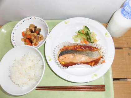 「ごはん、鮭の味噌マヨネーズ焼き、野菜のレモン醤油かけ、五目豆、牛乳」です。