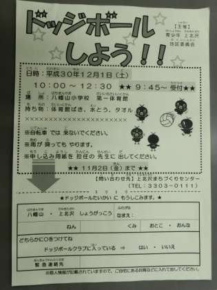 明日12月1日(土)に開催される、毎年恒例となっている、青少年上北沢地区委員会主催の「ドッジボール大会」について、参加申し込みをされている方への確認です。