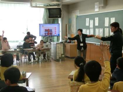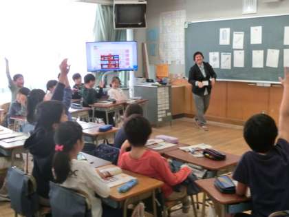 今日は中学年の教室で、ALTのアグネス先生の外国語活動が行われました。4年生は、絵カードを使っての神経衰弱です。カードの文房具を英語で発音します。なかなかペアが揃わずにやきもきしていましたが、みんな楽しく英語に親しんでいました。