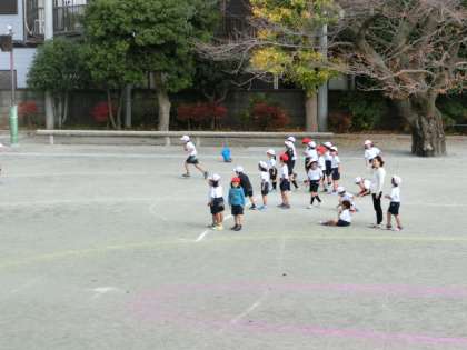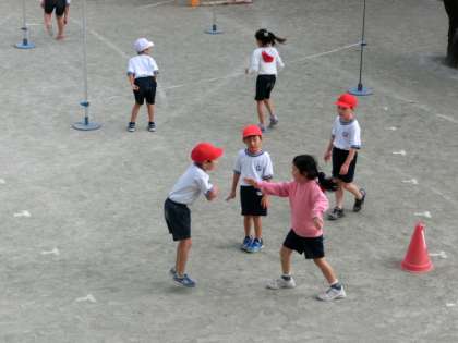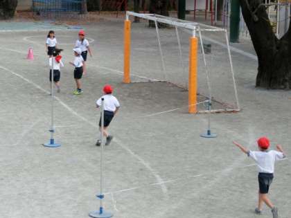 1年生の体育の授業は、校庭を走ったり跳んだり、楽しく身体を動かす、走跳の運動遊びです。校庭に置かれたさまざまな用具を使ったり、子どもたち同士でジャンケンしたりしながら、いろいろな動きを体験します。遊びの約束を守りながら、1年生は楽しく校庭を走り回っていました。