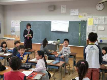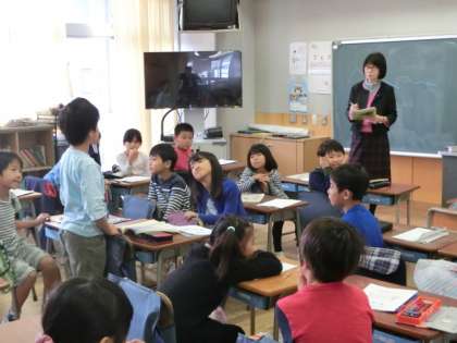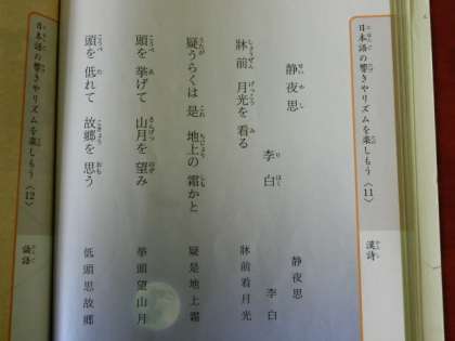 4校時の2組の教室では、坂口先生の教科「日本語」の授業が行われました。今日は、学習のまとめとして、李白の漢詩「静夜思」の暗唱テストです。繰り返し朗誦してきた成果でしょうか。大人でも難しい漢詩を、みんなすらすらと暗唱していました。
