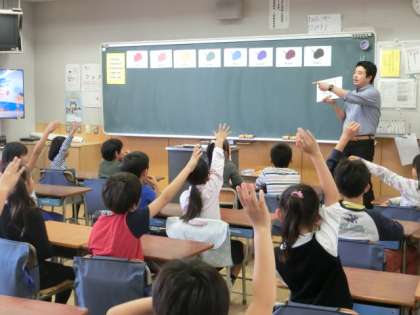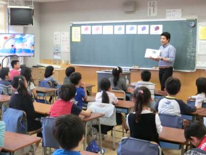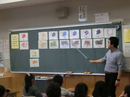 先週に引き続き、今日の5時間目も、2年2組で外国語活動の校内研究授業が行われました。今日は、“Brown bear,brown bear,what do you see ?”の絵本の読み聞かせをメインとした、低学年の外国語活動についての授業提案です。まずは、ウォーミングアップとして、「Colors I Like」を歌いながら、色についての既習事項の復習をします。