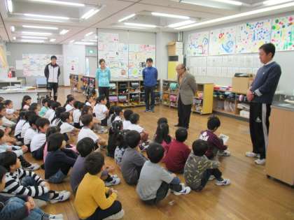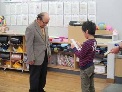 1年生は、菊の花をいただいたお礼に、全員で長島さんにお手紙を書きました。代表のお友達が手渡しすると、長島さんからは、「花を育てているところにも来てくださいね。」と声をかけていただきました。長島さんありがとうございました。